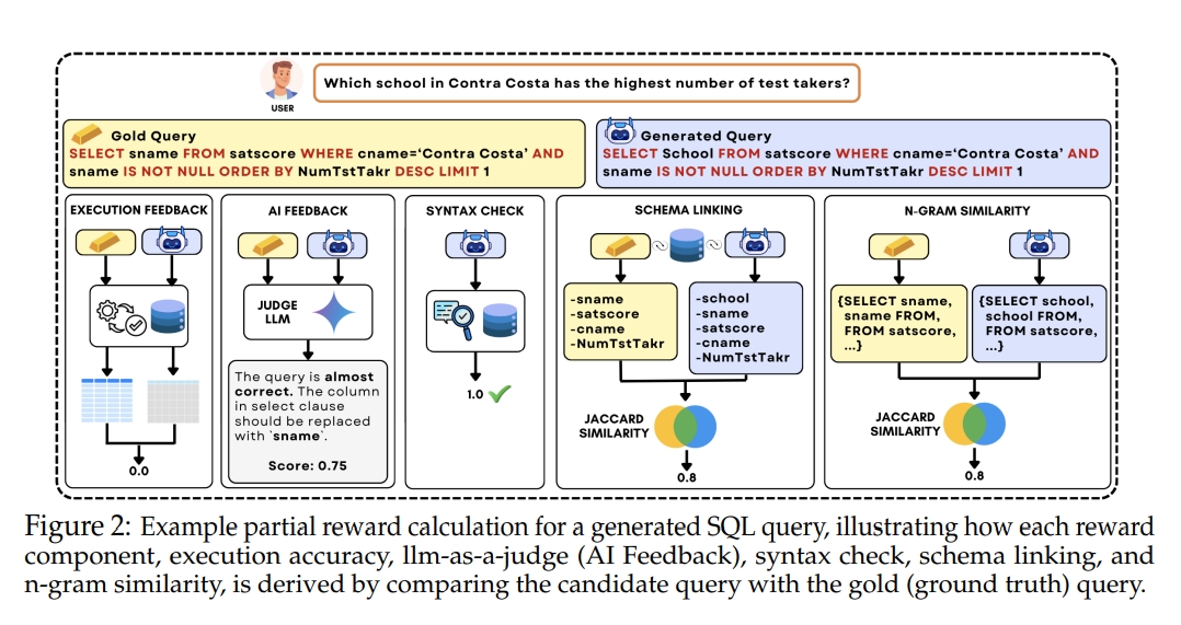 - 模式链接奖励:衡量生成查询中使用的数据库模式元素与正确查询之间的Jaccard相似度。这一奖励直接针对Text-to-SQL任务中模式理解的挑战,帮助模型更准确地将自然语言实体映射到数据库模式中。