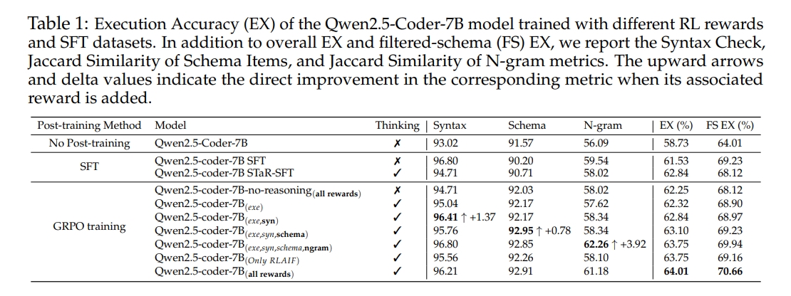 - 训练目标消融研究:通过对比使用不同奖励函数组合训练的模型,验证了复合奖励函数的有效性。实验结果表明,使用所有提出的奖励函数训练的模型在执行准确率和其他相关指标上均优于仅使用执行准确率奖励的模型。